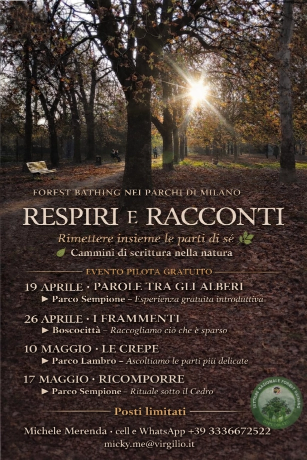 “Respiri e Racconti Milano – Rimettere Insieme le Parti di Sè” è un’esperienza in natura che unisce forest bathing, cammino lento e scrittura creativa nel cuore di Milano, scandito in quattro appuntamenti, in “quattro respiri”.